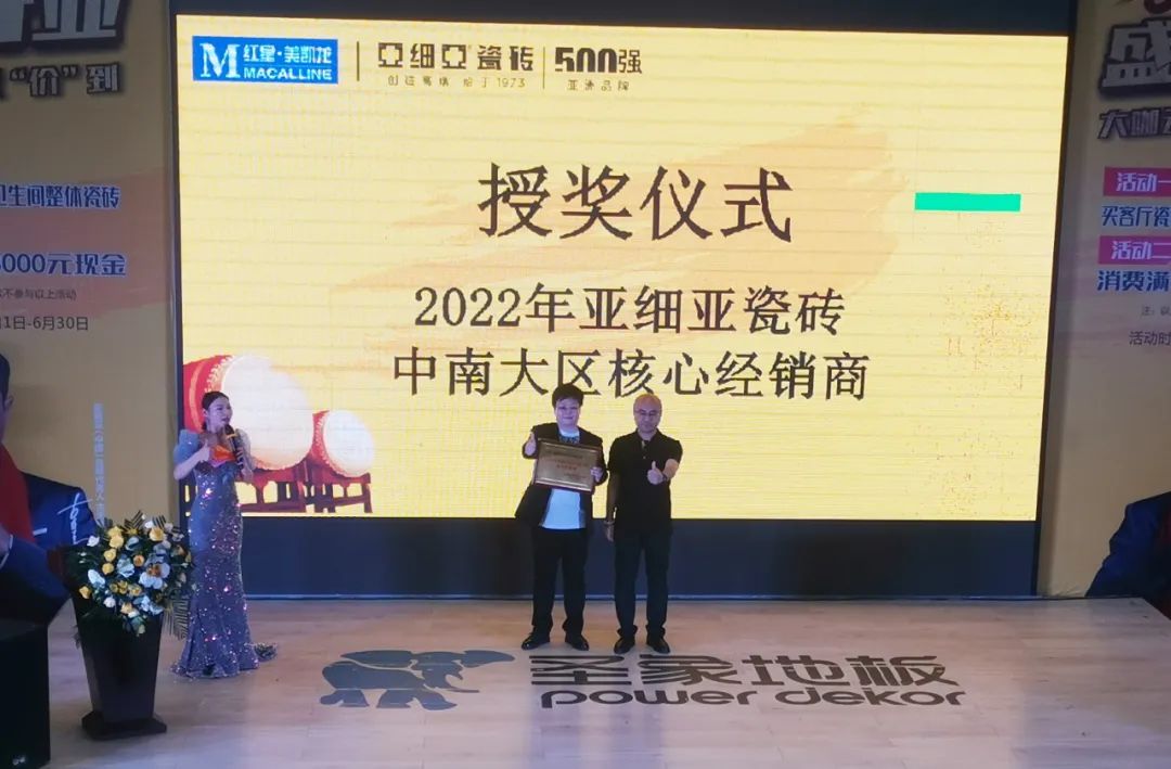 开业典礼上,亚细亚瓷砖恩施旗舰店经销商赵燕被特别授予了“中南大区核心经销商”的殊荣,以表彰她在门店筹备期间的辛勤付出。她凭着饱满的工作热情和踏实的积累,在短短半年内深耕渠道开拓,目前已与众多头部装饰企业达成战略合作。