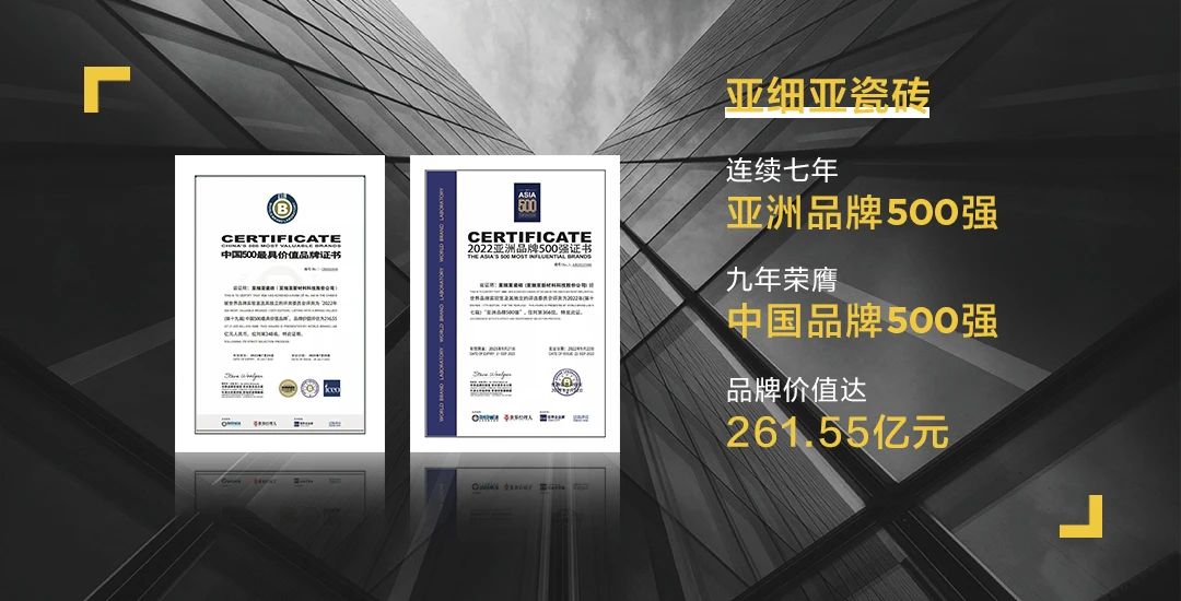 亚细亚瓷砖前身福丰窑业源于1973年台湾陶瓷之乡——莺歌镇,其初创之际即在亚洲建陶史上创造性地推出立体艺术瓷砖。1993年进驻内陆,1996年至1999年,连续四年均跻身上海市工业企业销售收入500强,于1998年在新加坡上市。2008年,金明集团强资入注收购亚细亚。自2009年荣获「中国品牌500强」以来,亚细亚品牌价值和排名连年上升。2016年,亚细亚签约古天乐,品牌形象强势升级,连续7年荣获「亚洲品牌500强」,9年荣膺「中国品牌500强」,品牌价值达261.55亿元。